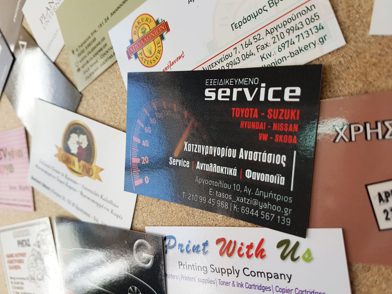 ΑCommon cardboard type, gloss or matte film laminated, special & luxury paper cards, luxury & special effects cards, eco paper cards, extra volume cardboard double or triple laminated cards, plastic cards, etc.